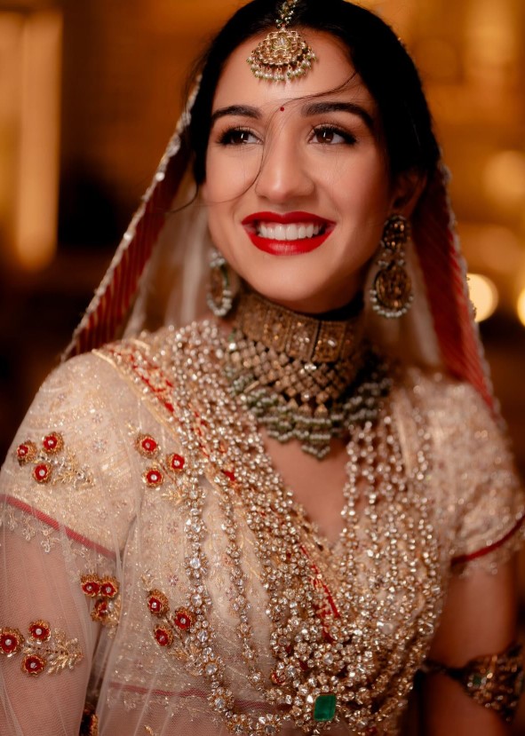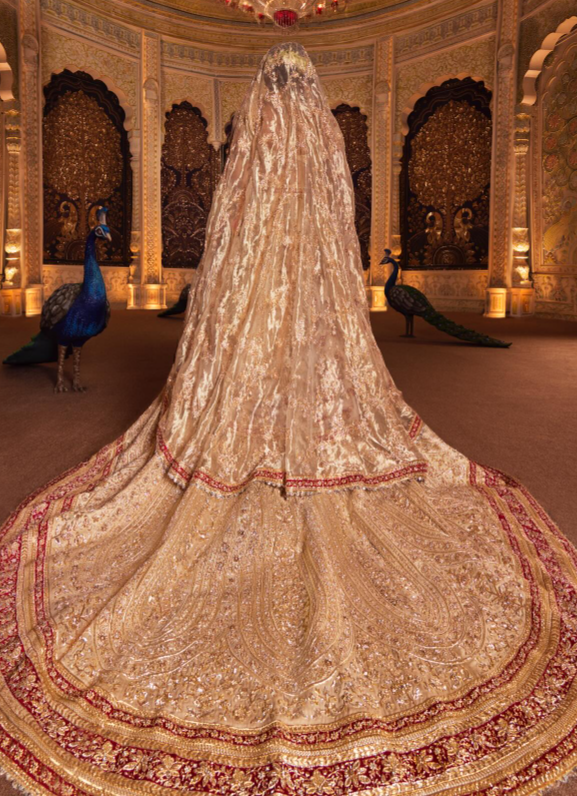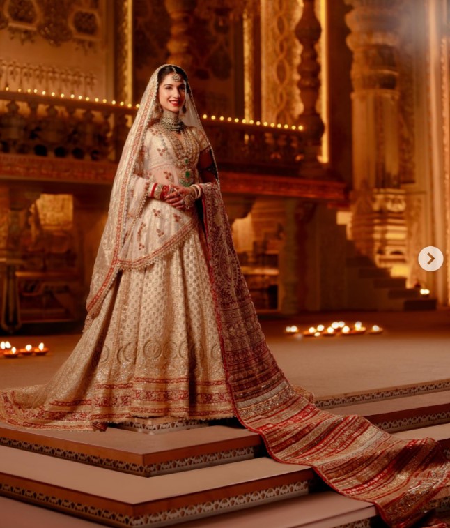 सिर्फ इतना ही नहीं, इसमें खूबसूरत फ्लोरल बूटी भी लगी हैं। दुल्हन के इस लहंगे को स्टोन, तांबा टिक्की और लाल रेशम का इस्तेमाल करके बनाया गया है। उनका हेड वेल 80 इंच लंबा है।