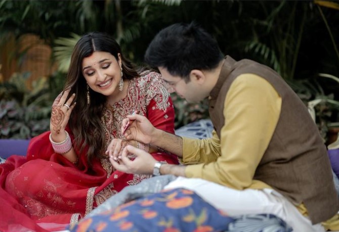 तीसरी तस्वीर में राघव चड्ढा पत्नी परिणीति चोपड़ा के हाथों में खुद मेहंदी लगाते हुए नजर आए। वहीं, एक्ट्रेस एक्साइटमेंट से मुस्कुराते हुए दिखीं।