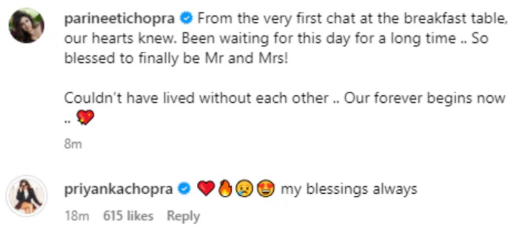 इसी के साथ प्रियंका ने दिल, फायर और शाइनी आंखों वाला इमोजी पोस्ट किया। बहन परिणीति की शादी की खुशी तो प्रियंका चोपड़ा ने व्यक्त की, लेकिन इसके साथ ही उन्होंने एक रोने वाला इमोजी भी पोस्ट किया, जिससे वह इस मोमेंट पर कितनी भावुक हैं, इसका अंदाजा लगाया जा सकता है।