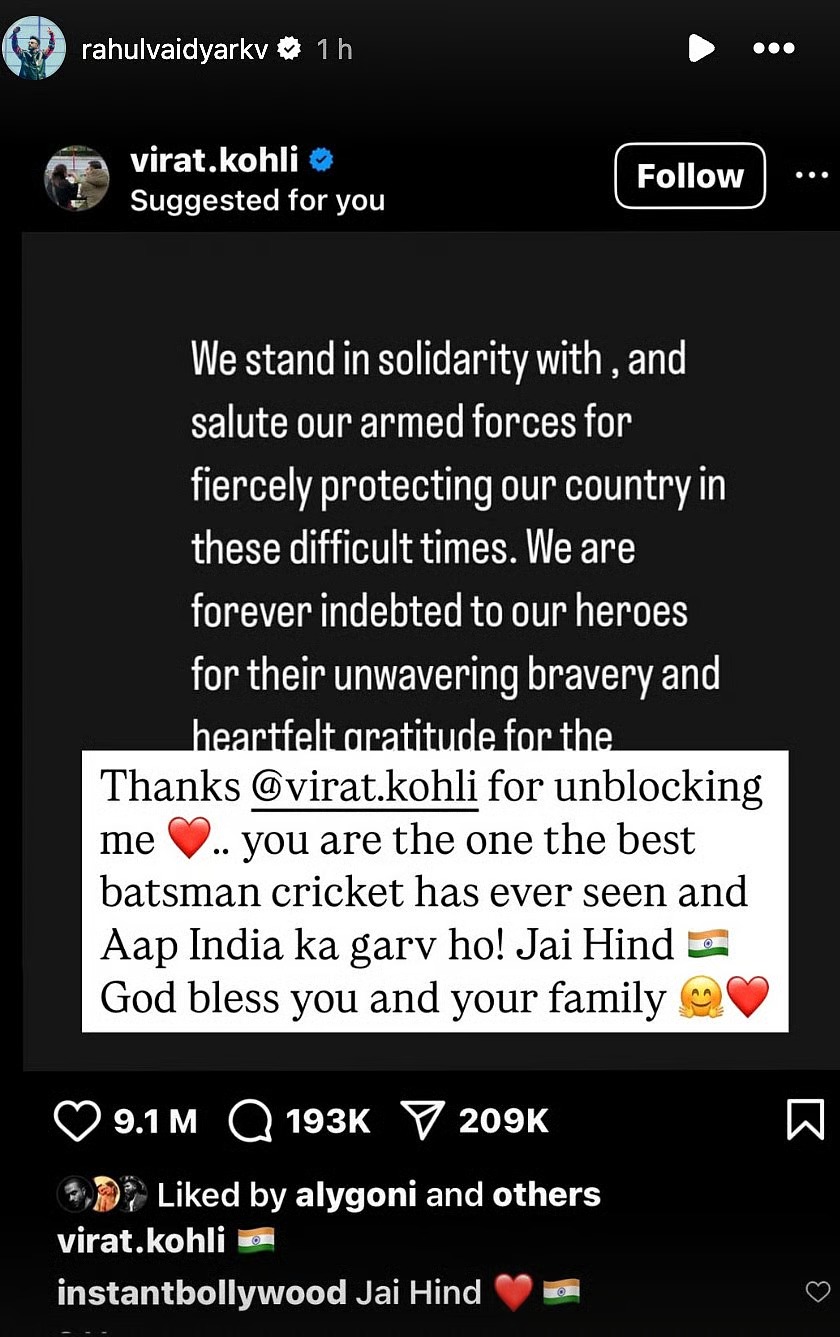 इस मामले में राहुल वैद्य कूद गए और चुटकी लेते हुए विराट कोहली को ही घेर बैठे। राहुल ने कहा कि विराट कोहली ने उन्हें ब्लॉक कर रखा है इंस्टाग्राम पर शायद ये भी एल्गोरिदम की वजह से हुआ होगा। इसके बाद विराट कोहली के फैंस ने राहुल वैद्य पर अपना गुस्सा निकाला लेकिन सिंगर यहां नहीं रुके और लगातार अपनी बातों और पोस्ट के जरिए कंट्रोवर्सी को हवा देते रहे।