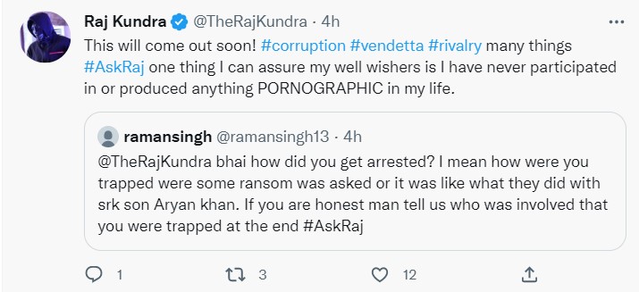 यूजर के इस सवाल पर राज कुंद्रा ने खुद को बेकसूर बताते हुए यह खुलासा किया कि इस मामले में भ्रष्टाचार समेत कई बातें शामिल हैं। उन्होंने कहा, 'मैं यह निश्चित कर सकता हूं कि कभी भी मैंने न तो अश्लीलता से जुड़ा कोई कंटेंट बनाया है न ही इसमें किसी भी रूप में मेरी भागीदारी रही है।'