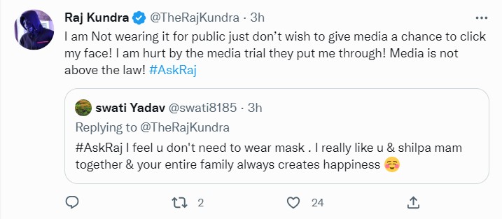 इंटरएक्टिव सेशन में स्वाति यादव नाम की एक यूजर ने राज से कहा 'मुझे लगता है आपको मास्क पहनने की जरूरत नहीं है। मुझे आप और शिल्पा मैम बहुत पसंद हैं और आपके पूरे परिवार को देखना हमेशा खुशियां देता है।' यूजर का इतना ही कहना था कि राज कुंद्रा ने बताया कि वह यह मास्क पब्लिक के लिए नहीं बल्कि मीडिया से छिपने के लिए पहनते हैं। वह पब्लिक प्लेस पर बिना चेहरा ढके आकर मीडिया को उनकी तस्वीरें क्लिक करने का मौका नहीं देना चाहते। उन्होंने बताया कि वह मीडिया ट्रायल से हर्ट हैं। मीडिया कानून से बढ़कर नहीं है।