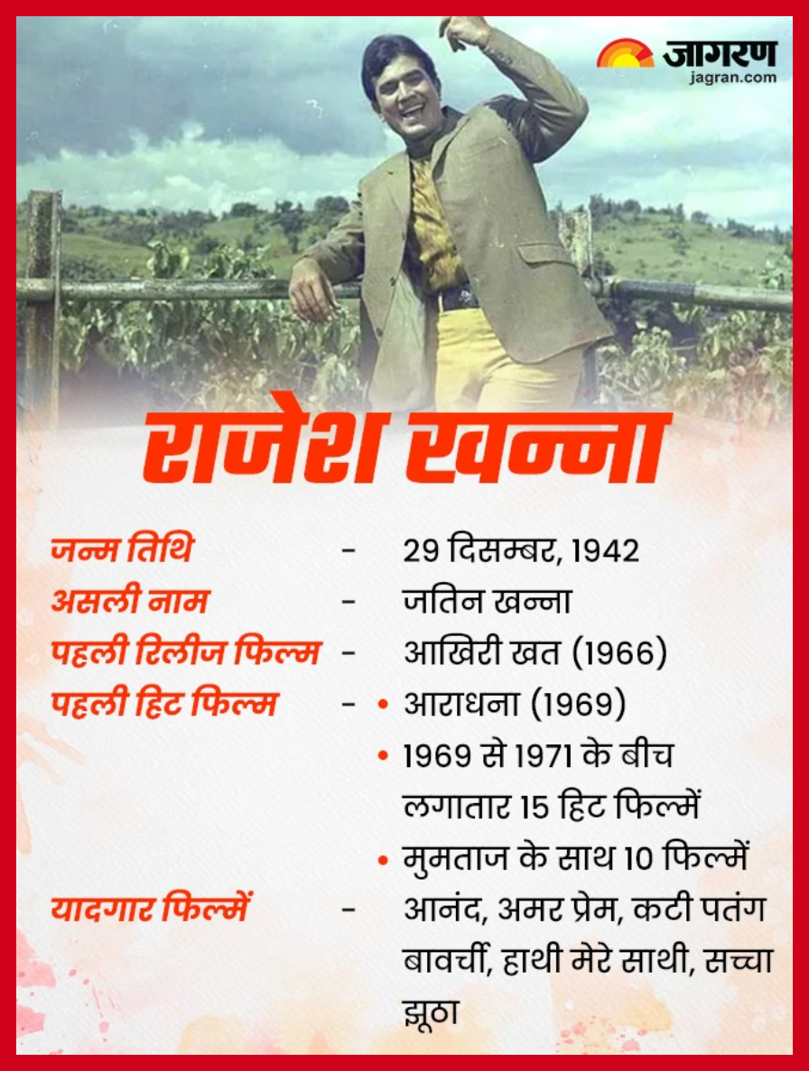 राजेश खन्ना का जन्म 29 दिसम्बर, 1942 को अमृतसर में हुआ था। उनका असली नाम जतिन खन्ना था। राजेश खन्ना का लालन-पालन मुंबई में हुआ था। पिता के रिश्तेदारों ने उन्हें गोद ले लिया था। राजेश खन्ना फिल्मों से पहले थिएटर करते थे। उनके बारे में मशहूर था कि स्पोर्ट्स कार में वो प्रोड्यूसर्स के ऑफिस काम मांगने जाते थे। जीतेंद्र उनके स्कूल के दोस्त थे। राजेश खन्ना का निधन 18 जुलाई 2012 को हो गया।