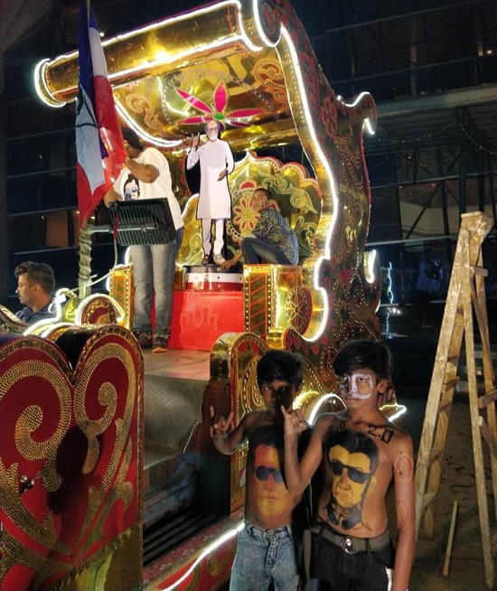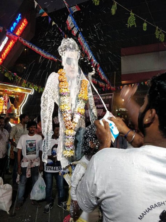 रजनीकांत के कटआउट को सजाये हुए रथ पर रख कर सिनेमाघर तक लाया गया। बच्चों ने अपने शरीर पर रजनीकांत का चित्र बनाया हुआ था।
