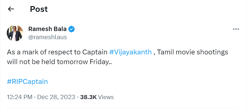 इससे पहले ट्रेड एनालिस्ट रमेश बाला ने एक पोस्ट किया था, जिसमें बताया था कि कैप्टन विजयकांत के सम्मान में कल यानी शुक्रवार को तमिलनाडू में किसी फिल्म की शूटिंग नहीं होगी। इसके अलावा आज होने वाले सभी शोज की भी शूटिंग को रोक दिया गया है।