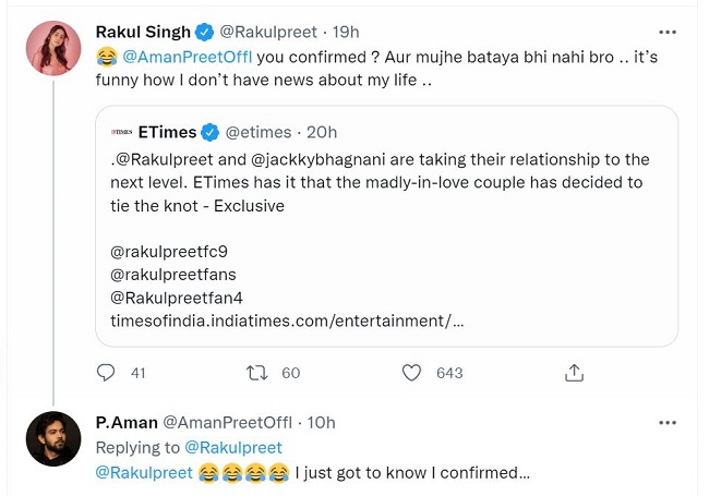इस बीच रकुल प्रीत सिंह ने इस पर प्रतिक्रिया देते हुए लिखा है, 'अमन प्रीत क्या आप वाकई में कंफर्म हो? मुझे बताया भी नहीं ब्रो। मेरे जीवन के बारे में मुझे ही पता नहीं। यह बहुत ही मजेदार बात है।' रकुल प्रीत के भाई ने इस पर प्रतिक्रिया देते हुए कहा है, 'मैं जानता हूं और मैं इसकी पुष्टि कर रहा हूं।' ट्वीट में आगे लिखा है, 'एनीवे शादी तो 2023 में होने वाली है अगर हम आज की स्टेट ऑफ माइंड को देखें दोनों फैमिली की तो।' अभी एक कहानी का भाग आप नहीं जानते, जो हमें अभी पता है।
