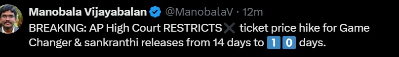 उनके मुताबिक आंध्र प्रदेश हाई कोर्ट ने गेंम चेंजर और संक्रातिकी वस्थूनम की रिलीज से पहले टिकटों की कीमत बढ़ाने की समयसीमा अब 14 दिन की बजाय 10 दिन कर दी है। कोर्ट के इस फैसले के बाद यकीनन तौर इन दोनों मूवीज के बॉक्स ऑफिस कलेक्शन पर सीधा असर पड़ सकता है।