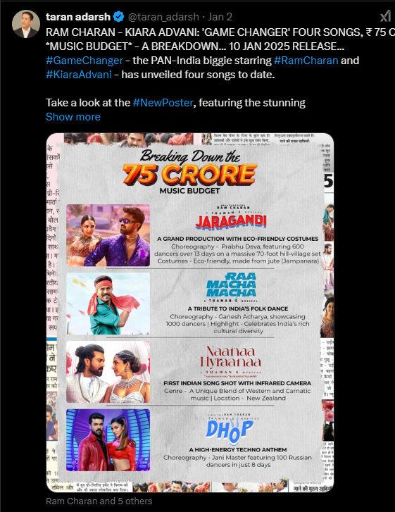 ट्रेड एनालिस्ट तरण आदर्श ने अपने आधिकारिक एक्स अकाउंट पर एक पोस्ट शेयर किया है। इस पोस्ट में उन्होंने बताया कि 'गेम चेंजर' के चार गानों 'जारागंडी', 'रा मचा-मचा', 'नाना याराना' और 'धोप' इन चार गानों सहित सिर्फ म्यूजिक का बजट ही 75 करोड़ रुपए के आसपास है।