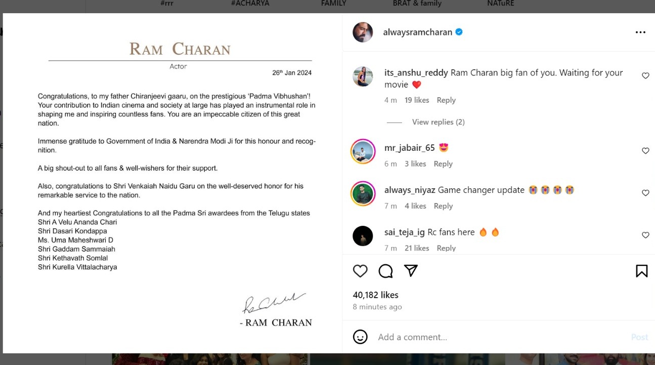 अपने फादर चिरंजीवी की पद्म विभूषण जीत पर हर्ष जताते हुए राम चरण ने अपने ऑफिशियल इंस्टाग्राम हैंडल पर एक लेटेस्ट एक लेटेस्ट पोस्ट शेयर किया है। इस पोस्ट में एक्टर ने लिखा है-