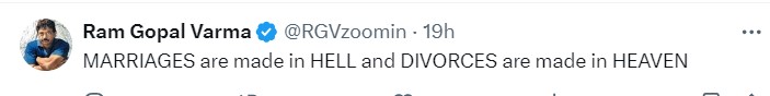 राम गोपाल वर्मा ने एक बाद एक कई ट्वीट किए। एक में उन्होंने लिखा, 'शादियां नरक में बनती हैं और तलाक स्वर्ग में।'