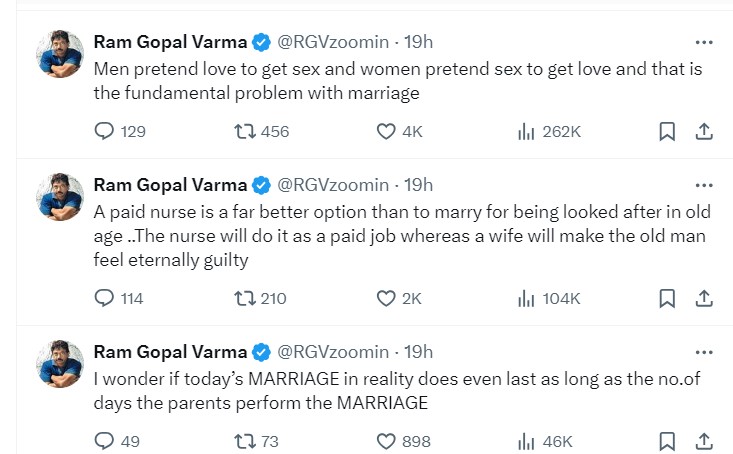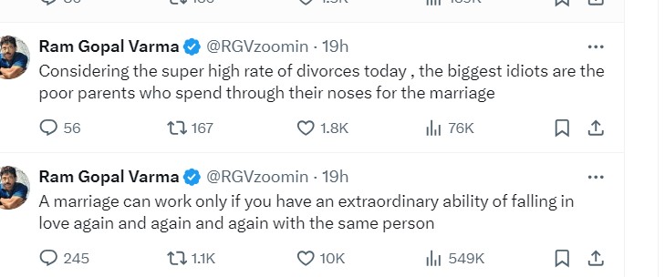 दोनों के अलग होने के बाद जहां लोगों ने अलग-अलग रिएक्शन दिया है, वहीं फिल्ममेकर राम गोपाल वर्मा ने शादी को लेकर कुछ पोस्ट किए हैं, जिसने लोगों का ध्यान अपनी ओर खींचा है।