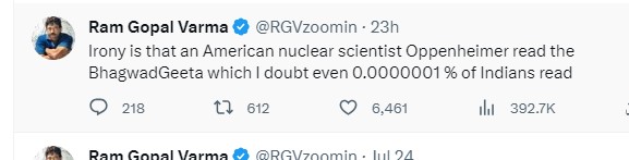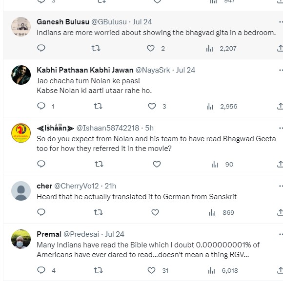 मालूम हो कि राम गोपाल वर्मा ने इससे पहले 'ओपेनहाइमर' की तारीफ की है। उन्होंने यह तक कह दिया कि अगर इस फिल्म को नहीं देखा, तो सिनेमा को नहीं जाना। हालांकि, भगवद गीता वाले सीन पर ऐसा ट्वीट करने पर फैंस ने उनकी ही क्लास लगा दी है। एक यूजर ने लिखा, 'इंडियन्स बेडरूम में भगवद गीता दिखाए जाने पर ज्यादा चिंतित हैं।'