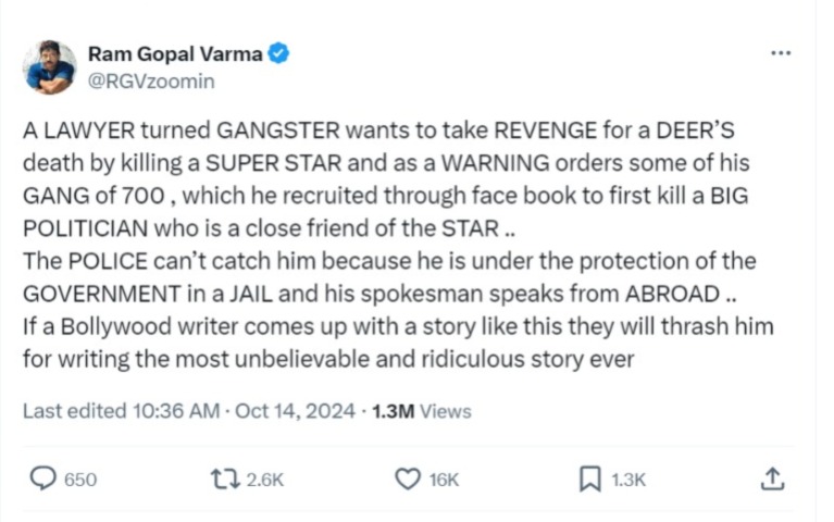 आग और सत्या जैसी फिल्मों को लेकर लोकप्रियता हासिल करने वाले राम गोपाल वर्मा अपने बेबाक अंदाज के लिए जाने जाते हैं। इस बार बाबा सिद्दीकी की हत्या और सलमान खान को लेकर गोपाल ने अपने ऑफिशियल हैंडल एक्स एक के बाद एक ट्वीट किए हैं, जिसमें उन्होंने लॉरेंस बिश्नोई को लेकर लिखा है-