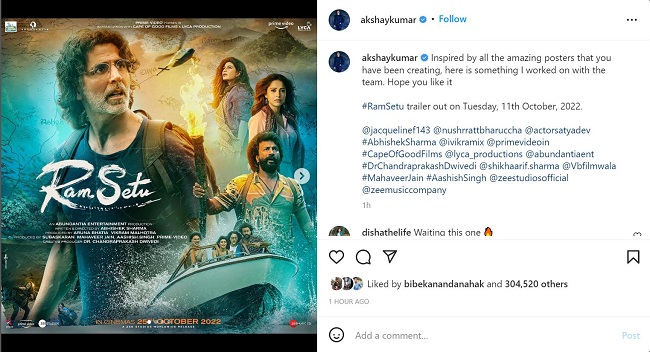 राम सेतु के पोस्टर में सभी को कुछ तलाश करते हुए देखा जा सकता है। वहीं अक्षय कुमार के चेहरे पर चौंकाने वाली लुक है। वहीं जैकलिन फर्नांडिस और नुशरत भरुचा भी तस्वीरों में कुछ सोचती नजर आ रही है। फिल्म निर्माता ने पोस्टर शेयर करते हुए लिखा है, '25 अक्टूबर 2022 से सिनेमाघरों में राम सेतु।' राम सेतु 25 अक्टूबर को सिनेमाघरों में रिलीज हो रही है। इस फिल्म का लेखन और निर्देशन अभिषेक शर्मा ने किया है। वहीं इस फिल्म का निर्माण अरुणा भाटिया, विक्रम मल्होत्रा ने किया है।
