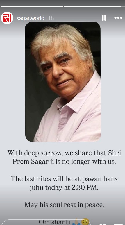 एंटरटेनमेंट डेस्क, नई दिल्ली। महान फिल्म निर्माता रामानंद सागर के बेटे और निर्माता शिव सागर के पिता प्रेम सागर का आज सुबह 10 बजे निधन हो गया। वह 84 वर्ष के थे। वह कुछ समय से अस्वस्थ थे और उन्हें मुंबई के ब्रीच कैंडी अस्पताल में भर्ती कराया गया था। रविवार को डॉक्टरों ने उन्हें घर ले जाने की सलाह दी और आज सुबह उनका निधन हो गया।