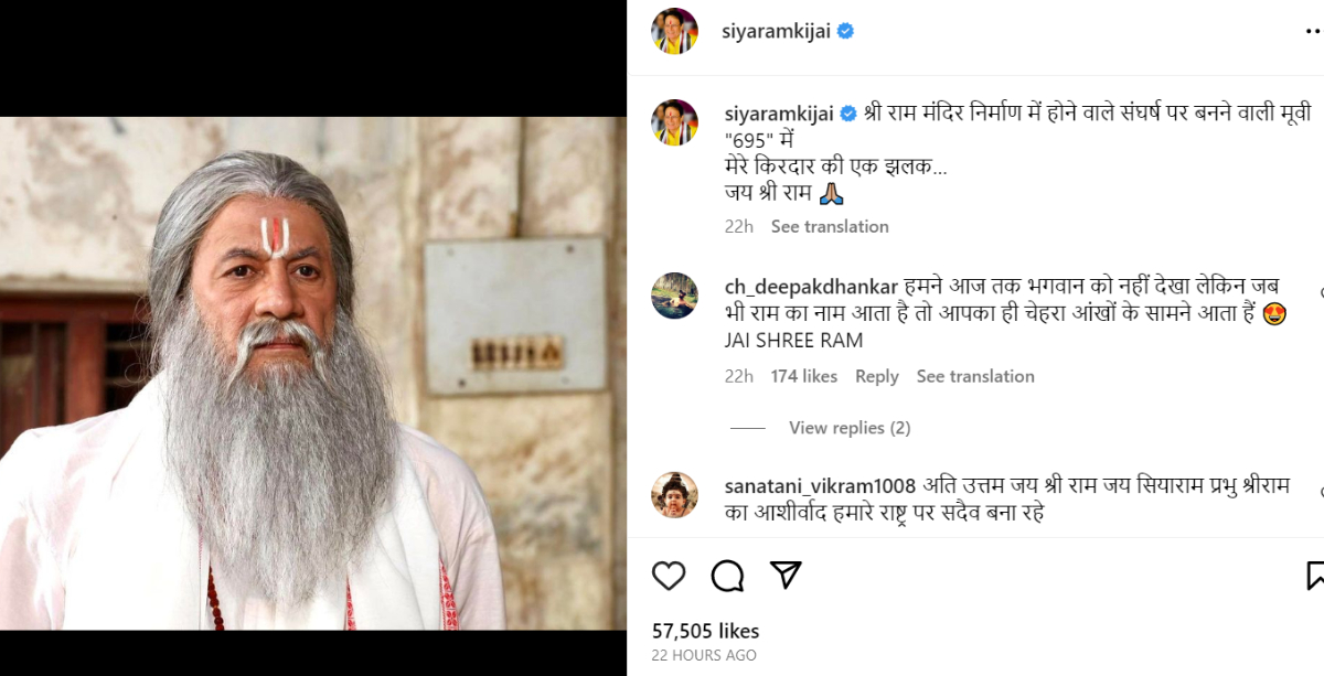 इससे पहले रविवार को उन्होंने इस फिल्म की घोषणा के साथ अपना लुक शेयर किया था। इसके साथ उन्होंने लिखा था- श्री राम मंदिर निर्माण में होने वाले संघर्ष पर बनने वाली मूवी "695" में मेरे किरदार की एक झलक…