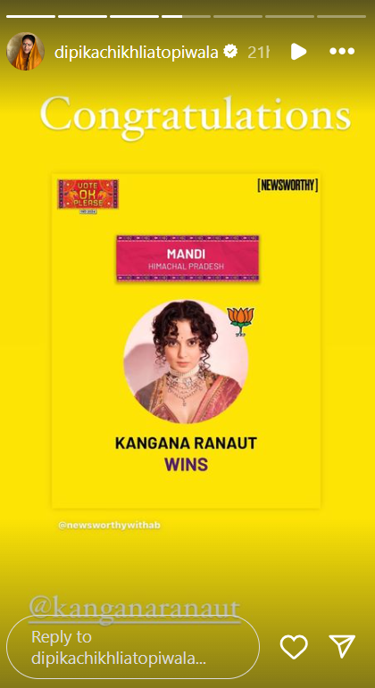 अपने 'रामायण' के को-स्टार अरुण गोविल की जीत के साथ-साथ दीपिका कंगना रनौत की जीत से भी काफी खुश हैं। उन्होंने मंडी से कंगना रनौत जैसे ही जीतीं, उनके लिए एक पोस्ट शेयर किया और उन्हें बधाई दी। आपको बता दें कि खुद दीपिका भी BJP की समर्थक हैं।