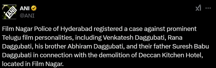 समाचार एजेंसी एएनआई ने थोड़ी देर पहले एक्स अकाउंट पर एक लेटेस्ट ट्वीट किया है, जिसमें राणा दग्गुबाती और फैमिली के खिलाफ पुलिस केस की जानकारी दी है। पूरी जानकारी के आधार पर बता दें-