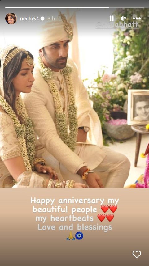 नीतू कपूर ने बेटे और बहू के लिए शादी से मंडप की फोटो शेयर की है। तस्वीर में दोनों स्टार वरमाला पहनकर बैठे हुए दिख रही हैं। वहीं, बैकग्राउंड में ऋषि कपूर की तस्वीर भी नजर आ रही है। पोस्ट को शेयर करते हुए नीतू ने लिखा, "मेरे खूबसूरत लोगों को हैप्पी एनिवर्सरी, मेरे दिल की धड़कन आपको ढेर सारा प्यार और आशीर्वाद।"