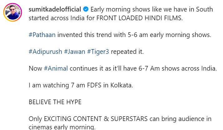 सुमित ने बताया है- एनिमल के मॉर्निंग शो की शुरुआत सुबह 6-7 बजे से हो जाएगी। गौर करने वाली बात ये है कि देश के अन्य राज्यों की तुलना में उत्तर भारत यानी खासतौर पर दिल्ली-एनसीआर में फिलहाल तड़के सुबह सर्दी का माहौल हो रहा है। ऐसे में ये देखना दिलचस्प रहेगा कि क्या इतनी सुबह फैंस सिनेमाघरों में एनिमल को देखने पहुंचेगे।