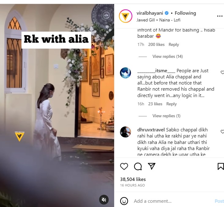इस वीडियो पर एक यूजर ने इस बात की तरफ ध्यान खींचा कि रणबीर ने खुद चप्पल नहीं उतारी। उन्होंने लिखा, 'सब लोग आलिया की चप्पल और बाकी चीजों की बात कर रहे हैं...लेकिन किसी ने इस बात पर गौर किया कि रणबीर ने अपनी चप्पल नहीं उतारी और सीधे अंदर चला गया...क्या कोई लॉजिक है इसमें...'
