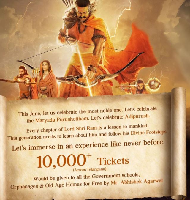 बीते दिन 'द कश्मीर फाइल्स' के प्रोड्यूसर अभिषेक अग्रवाल ने घोषणा की थी कि, वह तेलंगाना के सरकारी स्कूल, अनाथालय और वृद्धाश्रम में 'आदिपुरुष' की 10 हजार टिकट्स डोनेट करेंगे।