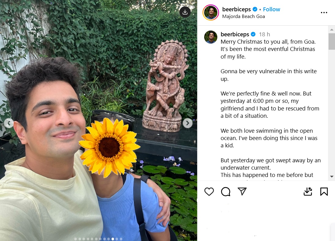 'गोवा की ओर से आप सभी को मेरी क्रिसमस। यह मेरे जीवन का सबसे अजीब क्रिसमस रहा है। हम अब बिल्कुल ठीक हैं। लेकिन कल शाम 6:00 बजे, मुझे और मेरी गर्लफ्रेंड को बड़ी स्थिति से बचाना पड़ा। हम दोनों को खुले समंदर में तैरना पसंद है। मैं यह तब से कर रहा हूं जब मैं बच्चा था। लेकिन कल हम पानी के नीचे की धारा में बह गए। ऐसा मेरे साथ पहले भी हो चुका है लेकिन मैं कभी किसी के साथ नहीं रहा। खुद को अकेल निकालना आसान होता है लेकिन किसी और को अपने साथ निकालना हो तो मुश्किल बढ़ जाती है।'