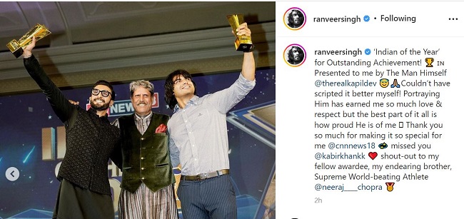 रणवीर सिंह ने कपिल देव के हाथों से अवार्ड मिलने पर खुशी जताई है। दरअसल उन्होंने फिल्म 83 में कपिल देव की ही भूमिका निभाई थी। उन्होंने अवार्ड पाने के बाद सोशल मीडिया पर लिखा, 'इंडियन ऑफ द ईयर अवार्ड, कपिल देव के हाथों, मेरे लिए इससे अच्छा कुछ नहीं हो सकता। उनकी भूमिका साकार करने के बाद मुझे ढेरों प्यार मिला है। मैंने इस अवसर पर कबीर खान को मिस किया। मैं मेरे भाई नीरज चोपड़ा को भी अवार्ड जीतने पर शुभकामनाएं देता हूं।'