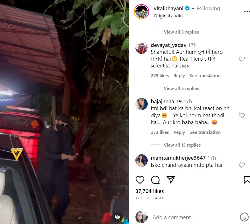 रणवीर का यह एटीट्यूड सोशल मीडिया यूजर्स को पसंद नहीं आया। इसी बात को लेकर उन्हें जमकर ट्रोल किया जा रहा है। एक ने कमेंट किया, "ऐसे ही बेवकूफ एक्टर को इंडिया में हाईप मिलती है।" इसी तरह एक अन्य यूजर ने लिखा, "शर्मनाक! और हम इनको हीरो मानते हैं। रियल हीरो हमारे साइंटिस्ट हैं।"
