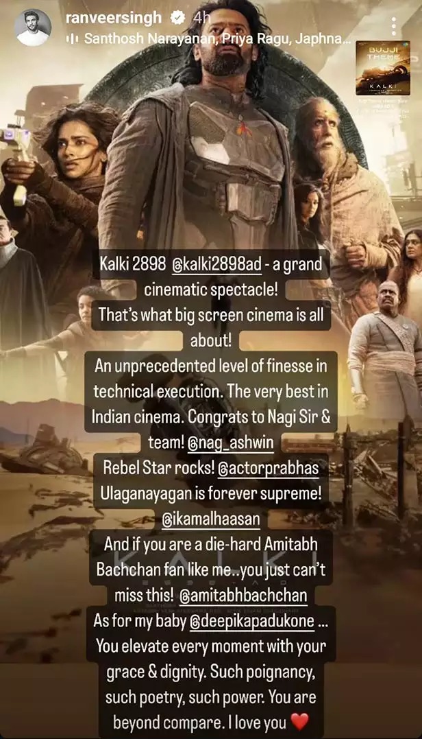 वहीं खलनायक के किरदार में नजर आए कमल हासन उसे मारना चाहते हैं क्योंकि उन्हें पता है कि ये बच्चा ही उनकी मौत का कारण बनेगा। दीपिका की तारीफ करते हुए रणवीर ने लिखा, "मेरी बेबी, तुम अपनी शालीनता और गरिमा से हर पल को ऊपर उठाती हो। तुम एक कविता, एक शक्ति हो। तुम तुलना से परे हो। मैं तुमसे प्यार करता हूं।"
