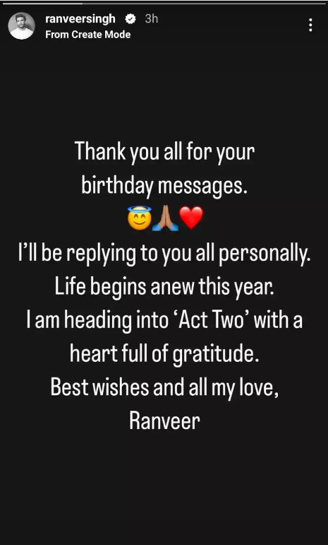 रणवीर सिंह अपनी मस्तानी से कितना प्यार करते हैं ये तो फैंस को भली भांति पता है, लेकिन वह अपने आने वाले बच्चे को गले से लगाने के लिए कितने ज्यादा उत्सुक हैं, इस बात का अंदाजा आपको उनकी इस पोस्ट से हो ही जाएगा। बीते दिन रणवीर सिंह ने अपनी इंस्टा स्टोरी पर फैंस से मिली जन्मदिन की बधाइयों का जवाब दिया।