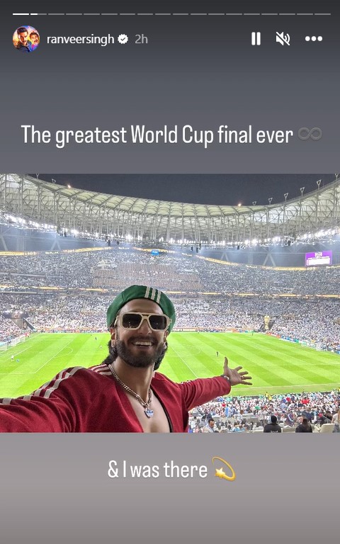 रणवीर सिंह को फुटबॉल खेलने का बहुत शौक है। यही कारण है कि वे खासतौर पर विश्व कप फाइनल के लिए कतर पहुंचे थे। उन्होंने जो वीडियो और फोटो शेयर किए हैं, उसमें मैच के लिए उनकी एक्साइटमेंट साफ तौर पर देखने को मिल रही है। वह मैच को लेकर डिस्कशन करते भी दिखे और हमेशा की तरह उनका एनर्जी लेवल मेंटेन रहा। वहीं, दीपिका पादुकोण शांति से पूरे मैच का आनंद लेती दिखीं।