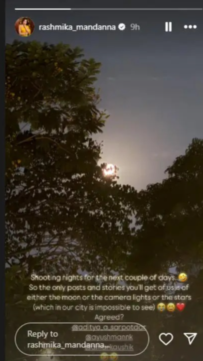 अपनी इंस्टाग्राम स्टोरीज में खूबसूरत रात के आसमान की एक झलक पोस्ट करते हुए 'पुष्पा' एक्ट्रेस ने लिखा,"अगले कुछ दिनों तक रात में शूटिंग करनी है..इसलिए आपको हमारे बारे में केवल चांद, कैमरे की रोशनी या सितारों के बारे में ही पोस्ट और कहानियां देखने को मिलेंगी।"