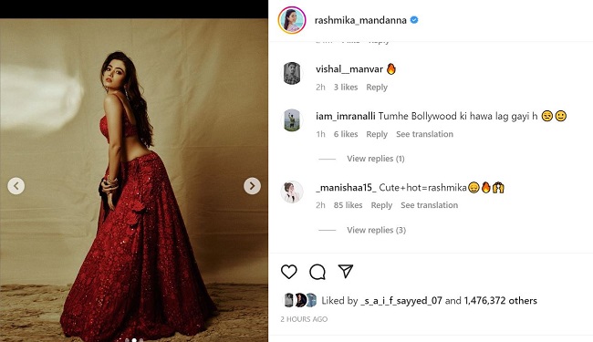 रश्मिका मंदाना ने तस्वीरें शेयर करते हुए लिखा है, 'धीरे-धीरे अब अपने बिजनेस की ओर चलना शुरू करिए।' रश्मिका मंदाना की तस्वीरें इंस्टाग्राम पर वायरल हो गई है। इसे 2 घंटे में 15 लाख से ज्यादा लाइक्स मिले हैं। वहीं तस्वीरों पर 11,000 से ज्यादा कमेंट किए गए हैं। कई लोगों ने तस्वीरों पर फैबुलस, सुपर, हॉट एंड सेक्सी, आपने तापमान बढ़ा दिया, आप की गर्मी से इंस्टा जल जाएगा, माई नेशनल क्रश, क्यूट प्लस हॉट इक्वल टू रश्मिका, चांद नजर आया, आपको बॉलीवुड की हवा लग गई है जैसे कमेंट किए हैं। रश्मिका मंदाना ने कुल 3 तस्वीरें शेयर की है। पहली तस्वीर में उनकी नजरें झुकी हुई है और वह हाथ पर हाथ रखकर पोज दे रही है। दूसरी तस्वीर वाइड है। इसमें वह झुककर पोज दे रही है। तीसरी तस्वीर में वह कैमरे की ओर देख रही है। उन्होंने अपने कमर पर हाथ रखा है और वह कातिल निगाहों से कैमरे की ओर देखती नजर आ रही है।
