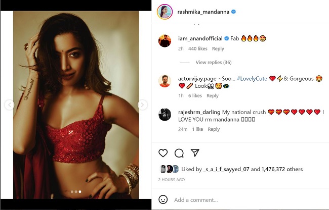 रश्मिका मंदाना की तस्वीरों को 2 घंटे में 15 लाख से ज्यादा लाइक्स मिले हैं।