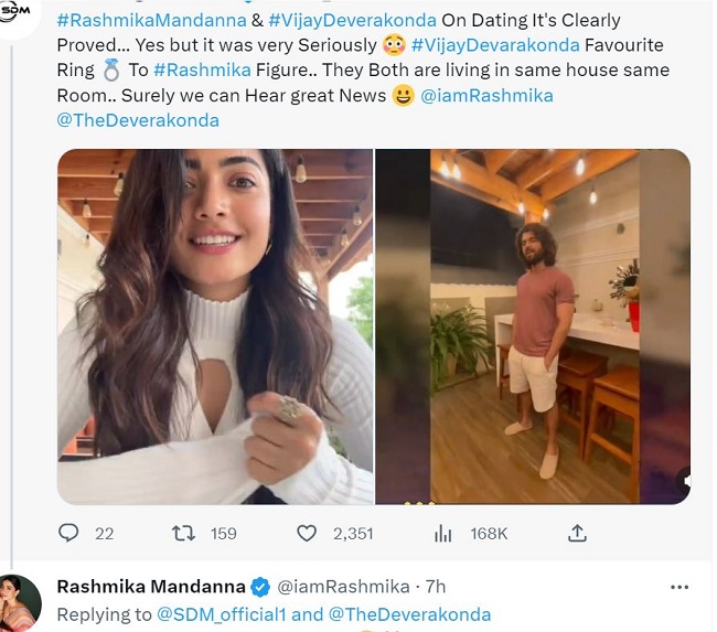 दरअसल रश्मिका मंदाना को लेकर खबरें हैं कि वह इन दिनों अभिनेता विजय देवोरकोंडा को डेट कर रही हैं और उनके हैदराबाद वाले घर पर रुकी हुई है। वहीं, दोनों को लेकर यह भी खबर आई थी कि दोनों का हाल ही में ब्रेकअप हो गया था। रश्मिका मंदाना को वीडियो में एक जगह बैठे हुए देखा जा सकता है, जहां दीवारों पर बल्ब लगे हुए हैं। यह विजय देवरकोंडा की वीडियो में नजर आ रही जगह से मिलती-जुलती है।