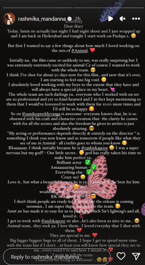 यह पहली बार होगा जब रणबीर और रश्मिका एक दूसरे के साथ स्क्रीन स्पेस शेयर करेंगे। एक्ट्रेस ने हाल ही में इस फिल्म को लेकर एक बड़ा अपडेट दिया है। सोशल मीडिया पर रश्मिका मंदाना ने बताया कि उन्होंने इस फिल्म की शूटिंग पूरी कर ली है, और अब वह हैदराबाद लौट चुकी हैं। इंस्टाग्राम पर शेयर की गई स्टोरी में उन्होंने 'एनिमल' की कास्ट की तारीफ की। इसके साथ ही उन्होंने रणबीर कपूर के लिए भी तारीफों के पुल बांध दिए।