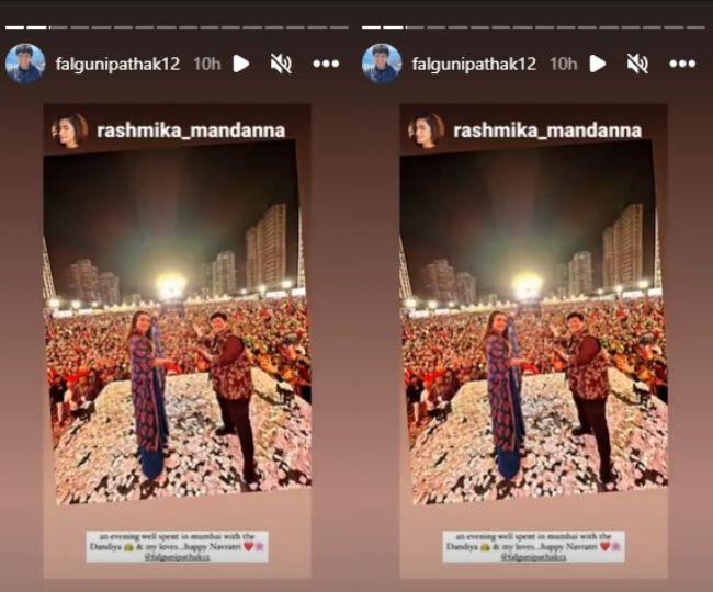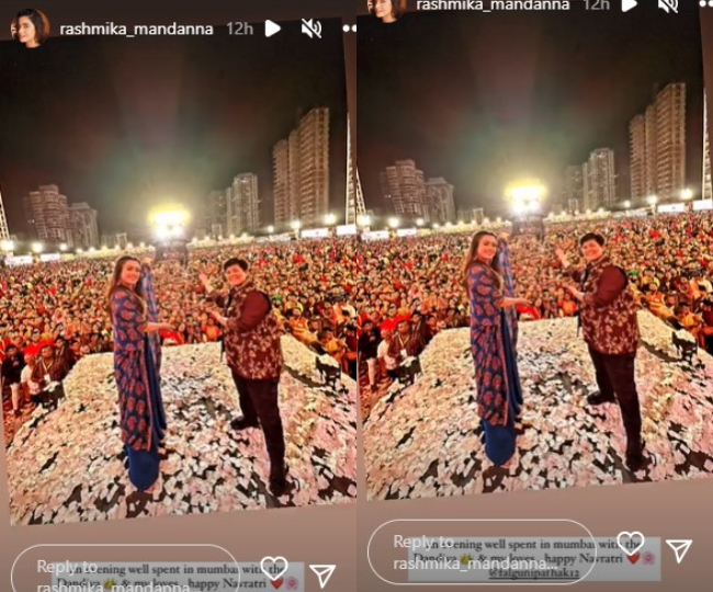 इस फोटो को शेयर करते हुए रश्मिका मंदाना ने कैप्शन में लिखा, 'मुंबई मे ये शाम बहुत ही शानदार रही डांडिया क्वीन और माय लव फाल्गुनी पाठक जी के साथ, नवरात्रि की आप सबको बधाई'। रश्मिका मंदाना इस दौरान पर्पल रंग के सूट में बेहद ही खूबसूरत रूप में दिखाई दीं, तो वही फाल्गुनी पाठक इस दौरान ब्राउन रंग की शर्ट पर गोल्डन और मैरून रंग की जैकेट और ब्लैक जींस में नजर आई। रश्मिका मंदाना की इस तस्वीर को फाल्गुनी पाठक ने अपने इंस्टाग्राम पर शेयर किया।