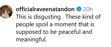 इंस्टाग्राम पेज ममराजी द्वारा शेयर किए गए वीडियो को देख कटरीना के फैंस शख्स पर बुरी तरह भड़क गए। रवीना टंडन ने भी कमेंट कर उनकी क्लास लगाई है। एक्ट्रेस ने कमेंट में लिखा, "यह वाहियात है। ऐसे लोगों ने उस पल को खराब कर दिया जो पीसफुल और मीनिंगफुल होना चाहिए था।"