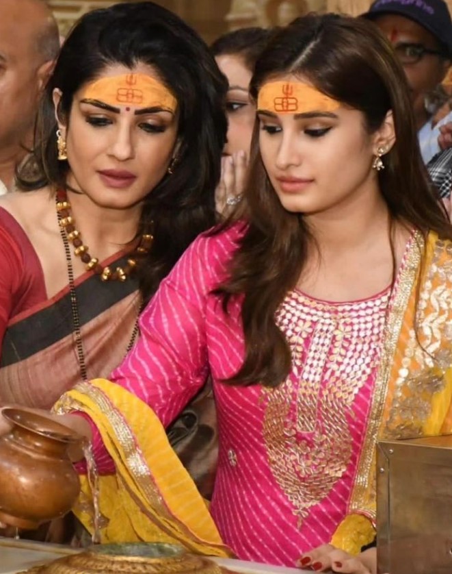 रवीना टंडन और राशा थडानी माथे पर त्रिपुंड तिलक लगाए और हाथ में पूजा की थाली लिए पहुंचीं। एक्ट्रेस ने बेटी के साथ पूजा के दौरान की भी कुछ फोटो शेयर की है। जिसमें रवीना और राशा, शिवलिंग पर जल चढ़ाते हुए नजर आ रही हैं। वीडियो को शेयर करते हुए रवीना टंडन ने कैप्शन में लिखा, "सोमनाथ! ॐ त्र्यम्बकं यजामहे सुगन्धिं पुष्टिवर्धनम् | उर्वारुकमिव बन्धनान्मृत्योर्मुक्षीय माऽमृतात् || हर हर महादेव!"
