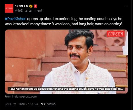 रवि किशन के फिल्मी करियर की बात करें तो इस साल की उनकी फिल्म लापता लेडीज ने खूब लाइमलाइट बटोरी। फिल्म में एक्टर ने पुलिस अधिकारी के रोल में दर्शकों का दिल जीत लिया। ये मूवी ऑस्कर तक भी पहुंची थी।