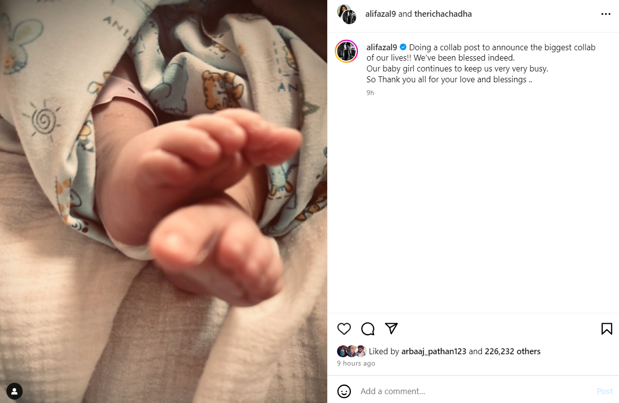 अली फजल और ऋचा चड्ढा ने अपने इंस्टाग्राम हैंडल पर बेटी के छोटे पैरों की पहली तस्वीर शेयर की है। हालांकि, चेहरा अभी तक इस कपल ने नहीं दिखाया है। इस फोटो के साथ कैप्शन में लिखा- 'हमारे जीवन के सबसे बड़े सहयोग की घोषणा करने के लिए एक पोस्ट कर रहे हैं। हम वास्तव में धन्य हैं। हमारी बच्ची हमें बहुत बिजी रखती है। इसलिए आपके प्यार और आशीर्वाद के लिए आप सभी का धन्यवाद।'
