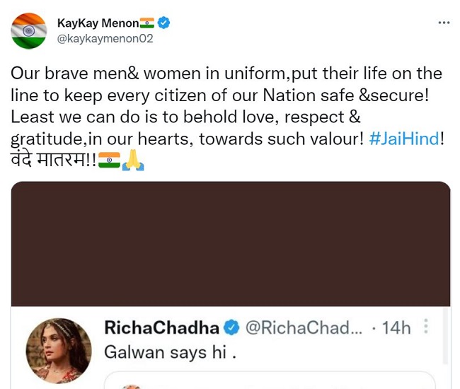 Richa Chadha Galwan Tweet Reactions ऋचा चड्ढा का भारतीय सेना को लेकर किया गया ट्वीट विवादों में है। अब इस पर फिल्म कलाकार के के मेनन ने प्रतिक्रिया दी है। इसके पहले ऋचा चड्ढा को कई कलाकारों ने लताड़ लगाई थी।