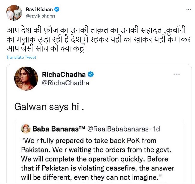 यह भी पढ़ें: Richa Chaddha भारतीय सेना का अपमान कर बुरी फंसी, रवि किशन ने साधा निशाना, कहा- यहीं का खाकर...