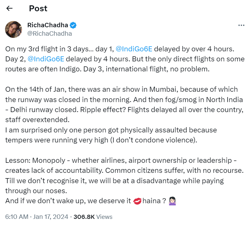 इस पोस्ट में एक्ट्रेस ने आगे लिखा, '14 जनवरी को मुंबई में एयर शो था, जिसकी वजह से सुबह रनवे बंद कर दिया गया और फिर उत्तर भारत में कोहरा/धुंध- दिल्ली रनवे बंद... क्या यह इसका असर था? पूरे देश में फ्लाइट्स में देरी हुई। कर्मचारियों को ज्यादा काम करना पड़ रहा है।