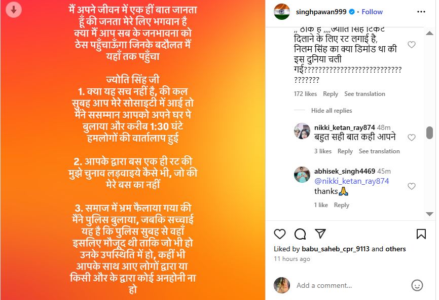 पवन सिंह ने हाल ही में अपने आधिकारिक इंस्टाग्राम अकाउंट पर ज्योति सिंह के आरोपों पर चुप्पी तोड़ते हुए लिखा, "मैं अपने जीवन में एक ही बात जानता हूं कि जनता मेरे लिए भगवान है। क्या मैं आपकी जनभावना को ठेस पहुंचाऊंगा, जिनकी बदौलत मैं यहां तक पहुंचा हूं। ज्योति सिंह जी क्या ये सच नहीं है कि जब कल आप मेरी सोसाइटी में आई थीं, तो मैंने आपको अपने घर पर सम्मान के साथ बुलाया और 1:30 घंटे हम लोगों की बातचीत हुई"।