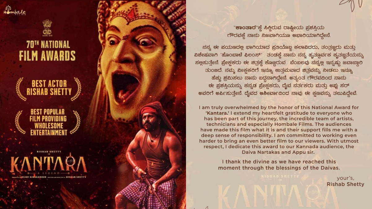 70वें राष्ट्रीय फिल्म पुरस्कारों ने 16 अगस्त को कन्नड़ फिल्म उद्योग की ब्लॉकबस्टर फिल्मों में से एक कांतारा को उचित पहचान दी । कन्नड़ अभिनेता ऋषभ शेट्टी ने कांतारा में अपने असाधारण प्रदर्शन के लिए प्रतिष्ठित सर्वश्रेष्ठ अभिनेता का पुरस्कार जीता । एक और मील का पत्थर जोड़ते हुए फिल्म ने सर्वश्रेष्ठ मनोरंजक फिल्म का राष्ट्रीय पुरस्कार जीता है ।