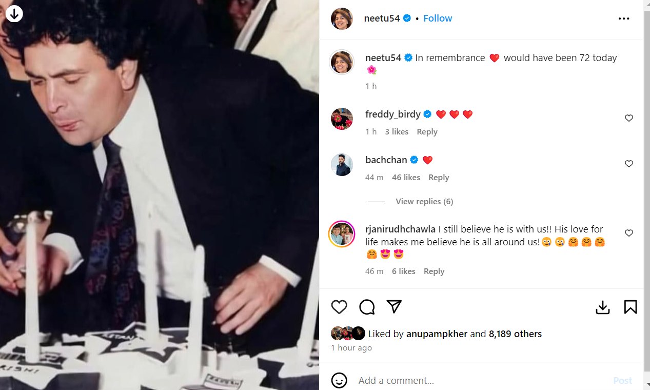 फोटो में ऋषि कपूर कैंडल्स पर फूंक मारते नजर आ रहे हैं। कैप्शन में नीतू ने लिखा- 'आपकी याद में। आज आप होते तो 72 साल के हो गए होते।' इसके अलावा नीतू कपूर ने अपनी इंस्टाग्राम स्टोरीज में ऋषि कपूर के साथ कई पुरानी तस्वीरें पोस्ट की हैं। इन तस्वीरों में लोगों ने अपने प्यारे चिंटू जी को बर्थडे विश किया है जिसे नीतू ने अपनी इंस्टा स्टोरी में रि पोस्ट किया है।