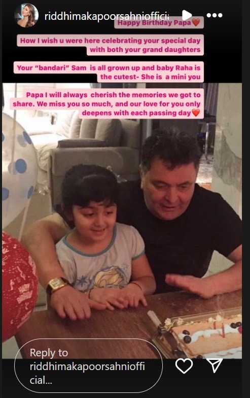 वहीं ऋषि कपूर की बेटी और रणबीर की बहन रिद्धिमा ने भी सोशल मीडिया हैंडल पर अपने पिता के लिए एक प्यारा सा नोट लिखकर उनकी एक पुरानी तस्वीर शेयर की है। उन्होंने यह भी बताया कि आलिया और रणबीर की बेटी राहा कपूर मिनी ऋषि कपूर हैं।