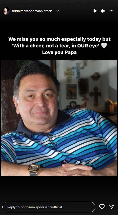 रिद्धिमा कपूर ने अपनी इंस्टा स्टोरी पर भी दिवंगत पिता ऋषि कपूर की एक तस्वीर शेयर और साथ ही एक खूबसूरत नोट भी लिखा है। इंस्टा स्टोरी में रिद्धिमा ने लिखा, "हम आपको बहुत याद करते हैं, खासकर आज के दिन लेकिन 'हंसते हुए, हमारी आंखों में आंसू के साथ नहीं, लव यू पापा।" इसके साथ उन्होंने व्हाइट हार्ट का इमोटिकॉन भी बनाया।